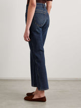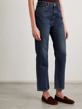 From pocket placement to the color of the topstitching, each detail of KHAITE's jeans is carefully considered to ensure an equally comfortable and flattering fit. This dark-blue 'Abigail' pair has a high rise topped with the signature enamelled button and straight legs that flare out slightly at the cuffs. Wear yours with everything from cardigans to crisp shirting.