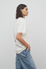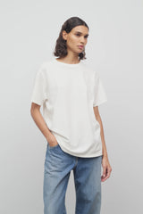 Relaxed t-shirt in brushed cotton silk jersey with dropped shoulder, ribbed crew neckline, and signature centre back detail.