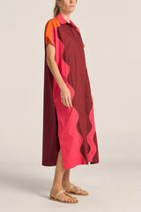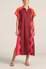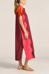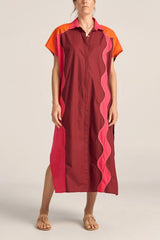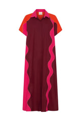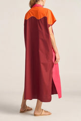 The Attica Shirt Dress is a vibrant oversized shirtdress crafted from crisp cotton poplin. The bright colours are patchworked together with a contrast hand stitching, a true labour of love. Midi length, with short cap sleeves and buttons running all the way down, it offers versatile styling options.