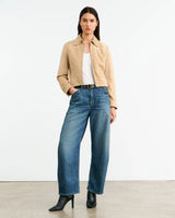 Suede jacket. Welt pockets and center front zip closure. Logo zipper pull. Slightly rounded collar with hook and bar closure at neck. Button closures at cuffs. Elastic hem at back. Fully lined.