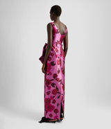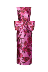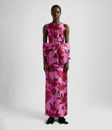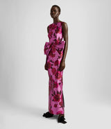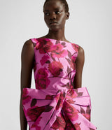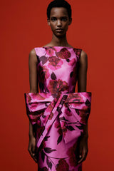 The latest collection pays homage to the opera singer Maria Callas, with 1950s and '60s couture design providing plenty of inspiration. This dress is cut from pink Mikado and printed with large-scale peonies evocative of the hand painted florals from the same era. It has a flattering boat neck and slim silhouette that's offset by a dramatic oversized bow at the waist.