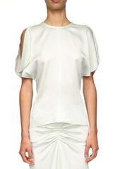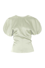 A deep-V neckline at the back creates a contemporary contrast with the demure round neckline, draped sleeves and modest over-the-hip hemline of this style. Crafted from crepe back satin, it is finished with an exposed baby-overlocking detail at the hem and back waist seam.