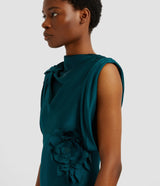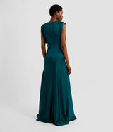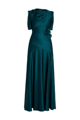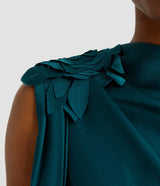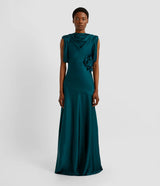 Cut from teal satin-faced cady, this floor-length gown is draped at the neck and shoulders. It is decorated with floral patches.