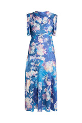 Cut from blue crinkled satin, this mid-length dress is printed with a pink floral. It is draped at the neckline and sleeves.