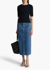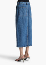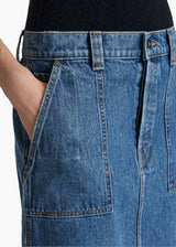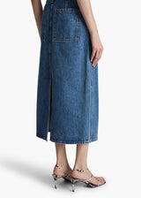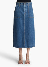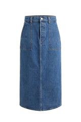 The Genevieve Skirt from KHAITE redefines everyday essentials with a chic, modern edge. Crafted in luxurious rigid indigo denim, this piece showcases a refined midi silhouette, large hip patch pockets, and a zip and button closure for a seamless look.