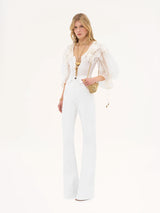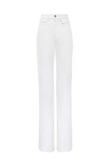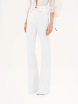 High-rise flare jeans in organic cotton denim with mini flap pockets at the waist.