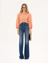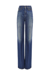 High-rise flare jeans in dark indigo wash organic cotton denim with mini flap pockets at the waist.