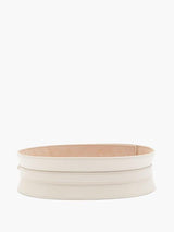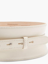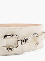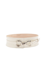 Ivory calfskin waist belt with adjustable fastening featuring an antique silver hook.