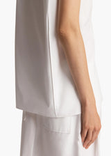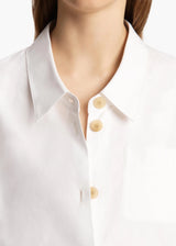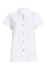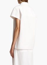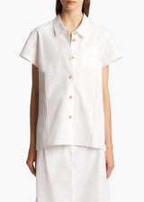 A short-sleeved button-up in crisp, cotton poplin refined by pin-tucks at front and back. With back yoke, welt pocket at chest, and gently arched hem.