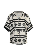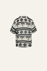 A relaxed-fit linen shirt featuring an artisanal print, perfect for effortless summer styling. Designed with a soft collar and short sleeves, it pairs seamlessly with the Roots Wrap Skirt for a coordinated look or can be styled with other pieces from the collection for versatile wear.