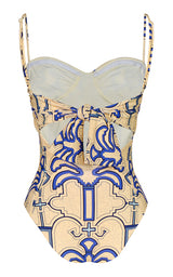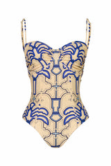This one-piece swimsuit form Johanna Ortiz has a bustier neckline, slim straps and features the brands palm motif in ecru and blue.