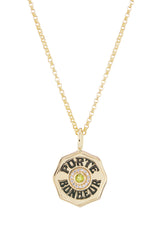 Marlo Laz's large pendant is inscribed with 'Porte Bonheur' – 'Lucky Charm' in French – so it's the perfect style to always have close. It's handmade from polished 14-karat gold and set with sparkling diamonds around a green peridot gem, reminiscent of the star-speckled night sky.