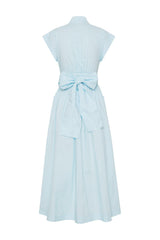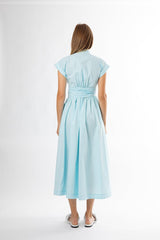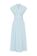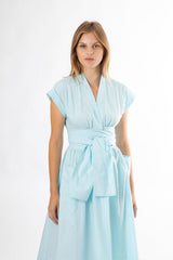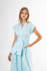 The London Wrap Dress is a mid-length wrap dress featuring a V-neckline and two side pockets. Ties at the front.