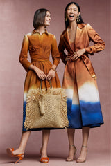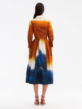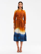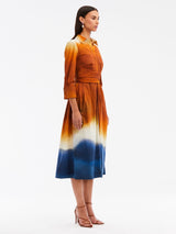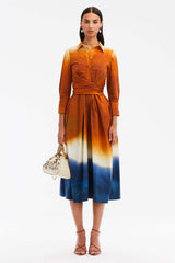 This shirt dress from Oscar de la Renta has been crafted from a stretch cotton with an all over abstract ombre effect. It features a button placket with a pointed collar, 3/4 sleeves and a cross over detail at the waist.