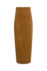A high-waisted suede pencil skirt designed for a corset-like fit and shaped by darts. With a high slit and a concealed zipper closure at the back.