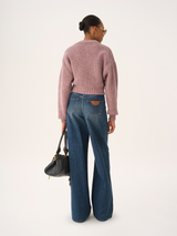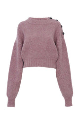Cropped mock-neck jumper in Donegal wool, featuring shiny leather buttons at the left shoulder and ribbed trims.