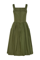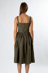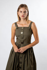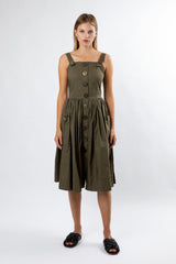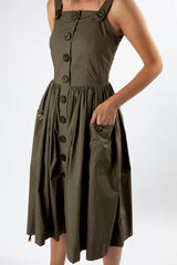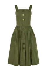 The Milan Button Thru Dress is a midi-length dress that sits just below the knee. Featuring a cinched in waist, button detailing throughout and two front pockets.