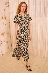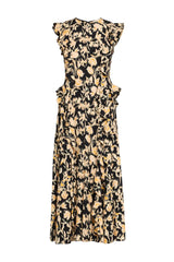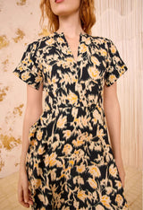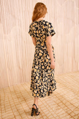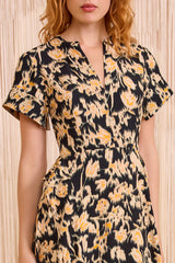 The Nadya Dress is beautifully structured from satin-back crepe, a signature fabrication with a silky-smooth underside, and is adorned with tonal stitching at the sleeves. The surreal ikat florals create a rich visual dialogue, while the cascading ruffle adds poetic movement.