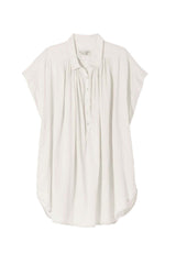 Oversized, voluminous pullover blouse. Dropped shoulder. Centre front half button down with troka buttons. Shirring throughout front and back. Small collar. Shirttail hem. Hanger loop detail at back. Easily able to tuck in.