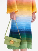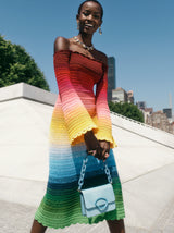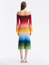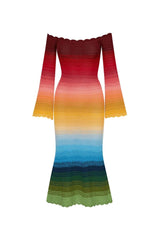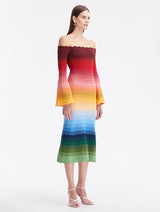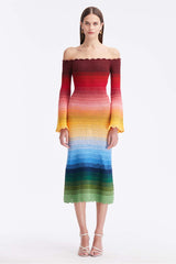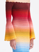 This long sleeve, off-the-shoulder knit has been crafted in the US from a rainbow ombre crochet. Designed for a close fit features a midi length, slightly bell sleeves and is finished with scalloped edging.
