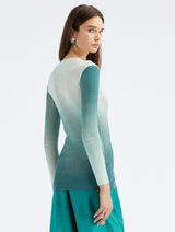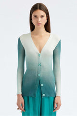 This ribbed-knit-cardigan is defined by cascading tones of jade. It has a crew neckline and banded trim.