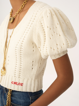 V-neck cardigan in a lower-impact chunky wool and cashmere knit, featuring short puff sleeves, fabric-covered buttons and Chloé logo embroidery at the hem.