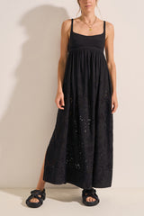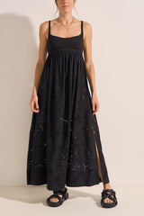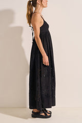The Raven dress from Ilio Nema features an Empire-line silhouette with the maxi length and is detailed with cotton-linen eyelet embroidery.