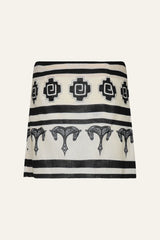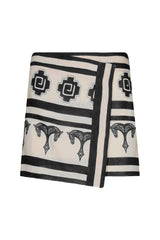 A linen wrap mini skirt featuring bold geometric prints and intricate detailing. Its structured yet breezy silhouette makes it a versatile staple, perfect for pairing with it the matching top or a fitted bodysuit.