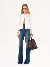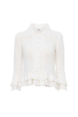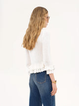 Fitted ruffled cardigan in a crochet knit, featuring mother-of-pearl buttons and layered frills at the hem and cuffs.