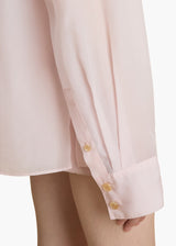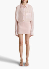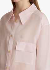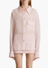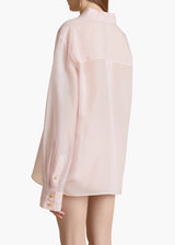 Clean lines and lofty silk organza make this button-up legible on the body. Dropped shoulder seams. Pleating at yoked back and two-button cuffs.