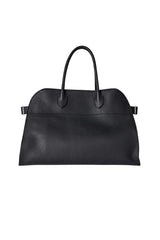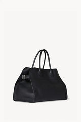 Softly structured top-handle bag in matte grained calfskin leather with belted gusseted side panels and interior toggle closure.