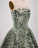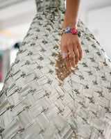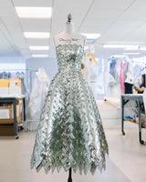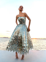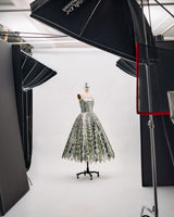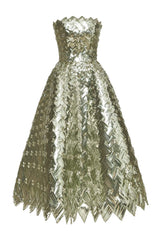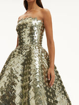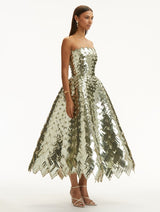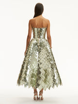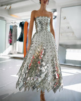 This tea-length cocktail dress is a dazzling display of House craftsmanship, with every inch woven from light-catching sequins. Geometric crystal placements amplify its shine, bringing modern artistry to a timeless silhouette.