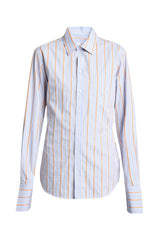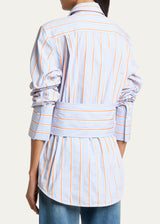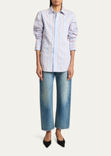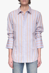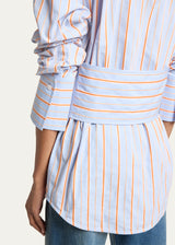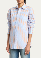 Signature shirting is part of the Victoria Beckham brand DNA. Crafted from a crisp stripe cotton in delphinium and orange, this style has been fashioned on a men’s silhouette. It has elongated cuffs, a curved hem and a pointed collar.