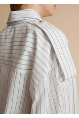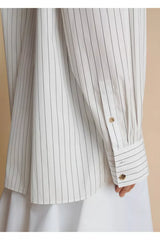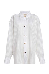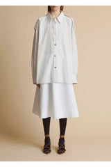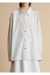 The Tamal top by Khaite offers a fresh take on the classic striped shirt with its oversized fit, providing a bold yet effortless style statement. Constructed of cotton, this piece features a spread collar, long sleeves with barrel cuffs, shoulder epaulets, and a front button closure, blending traditional elements with contemporary flair.