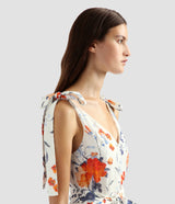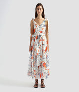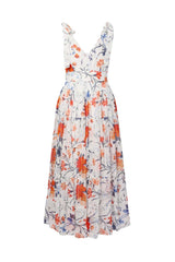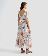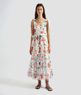 This summery dress is cut from lightweight cotton silk voile that is decorated with the season’s Floral Trellis design. The vivid pattern blends carnations, anemones, bluebells, and daisies in a palette of red, pale blue and navy. Cut for an ankle-length silhouette, this dress has tie-fastening shoulders, a belted waist and a tiered skirt that gently sways as you move.