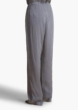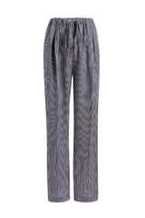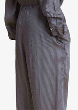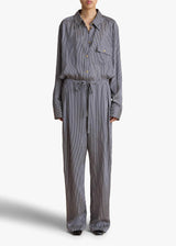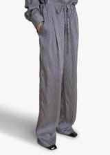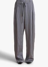 A relaxed, pleated-front pant refined by silky stripes. With grommeted drawstring waist, in-seam side pockets, and back welt pocket.