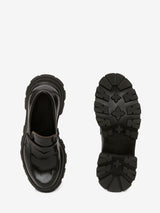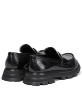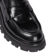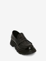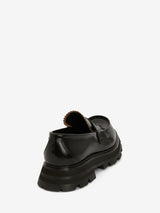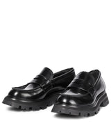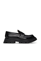 These black shiny spazzolato calf leather loafer feature top-stitch detailing, an exaggerated flared rubber lug sole and a round toe shape. Finished with an Alexander McQueen signature on the inside sole.