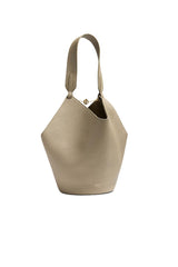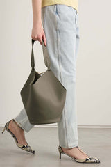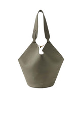A scarf-inspired tote in pebbled calfskin. Designed to be especially lightweight, with rounded base for stability. Jewellery-like toggle closure at interior.