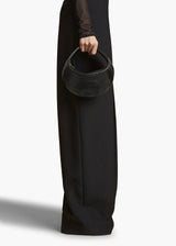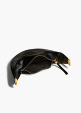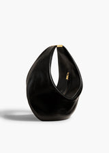 A slouchy zip-top hobo bag on a compact scale. With integrated strap that fastens with a magnetic jewellery clasp for easy access to interior.