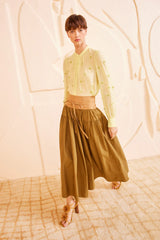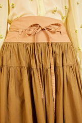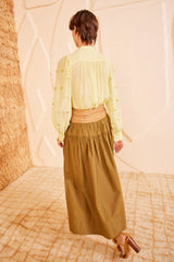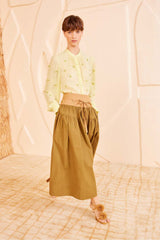 The Angeline Skirt is made from water-washed poplin with a tromp l’oeil, layered look created by our seasonal utilitarian colour-blocking. This khaki and green style has a timeless A-line profile with light gathering, a removable self-tie belt, and a billowing midi hemline. It fastens with buttons at the side.