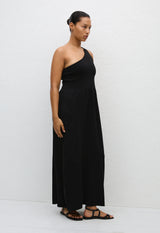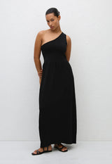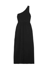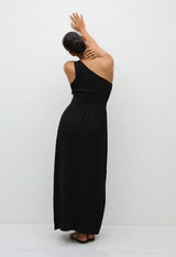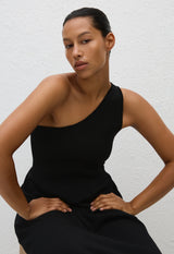 An effortless pull-on one shoulder knit dress. Its bodice is made from bandage knit dry handle viscose for a contoured fit, with a slightly lighter weight crepe knit skirt.