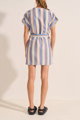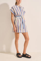 The Athena Tunic has been crafted in India from a handloomed cotton lurex stripe. The mini style features cuffed short sleeves and a tie to sinch in the waist.