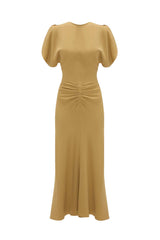 Reimagined in a gentle shade of honey, the elegant Gathered Waist Midi Dress has a ruched front, tulip sleeve detail and gentle V-neck at the back. Immaculately cut to accentuate the waistline for a classic fit-and-flare silhouette, the Gathered Waist Midi Dress exudes a modern refinement.