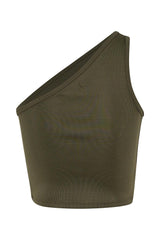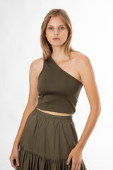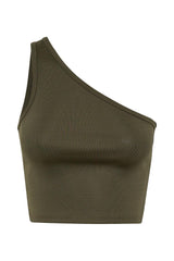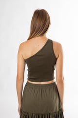 The Brazil One Shoulder Top is a cropped one shoulder top with a stretch fit. Sits mid waist.