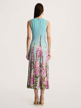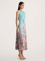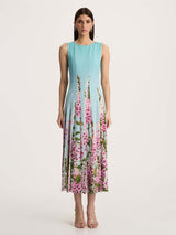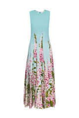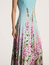 Chiffon insets slice through the fitted bodice and flared skirt, creating fluid pleats that move with ease. The design blooms into a degradé foxglove motif, where cascading blossoms climb the length of the silhouette with painterly grace.