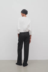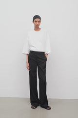 Classic tailored pant in Japanese tropical wool with pressed front and back creases, side slash pockets, and back besom pocket.