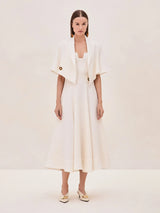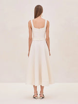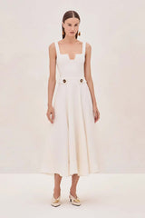 The Fiore Dress features a chic square neckline and a subtle cut-out detail, adding a modern twist to its timeless silhouette. The fitted bodice effortlessly transitions into a full skirt, striking the perfect balance between elegance and movement. The gold buttons add a touch of luxury, giving this dress just the right amount of standout appeal.