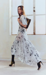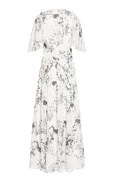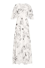 As seen in the Pre Fall '23 campaign, Victoria Beckham's floaty godet plisse dress features a v neckline and voluminous skirt with abstract printed flowers.