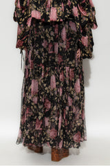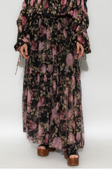 Gathered maxi skirt in organic silk mousseline with a floral print inspired by the Maison's heritage. The fluid, tiered silhouette includes a silk-mix lining, while a dangling side tie with hammered metal tips finishes this piece.