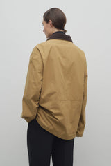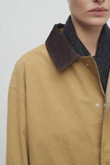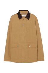Outdoor jacket in enzyme-washed cotton with contrast corduroy collar, front patch pockets, and concealed front placket with snap and zipper closure.